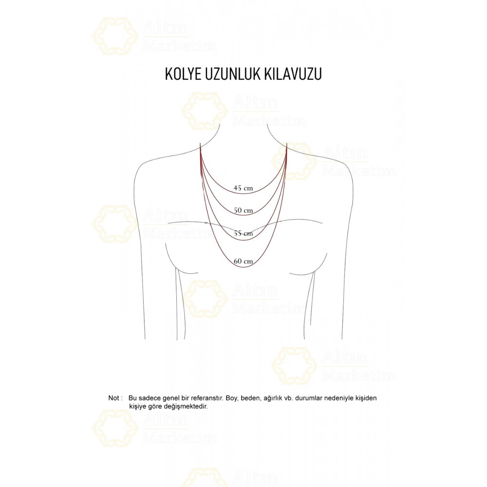 Hazır seçeneklerimiz arasında beğendiğiniz bu ürünü Gümüş, Sarı Altın, Rose Altın renklerinde ve 45 cm, 50 cm, 55 cm, 60 cm zincir boyutlarında ürettirebilirsiniz. 55 cm ya da 60 cm zincir uzunluğu seçildiği durumlarda 10 TL ekstra zincir üretim ücretini yansıtmak durumunda kalıyoruz.